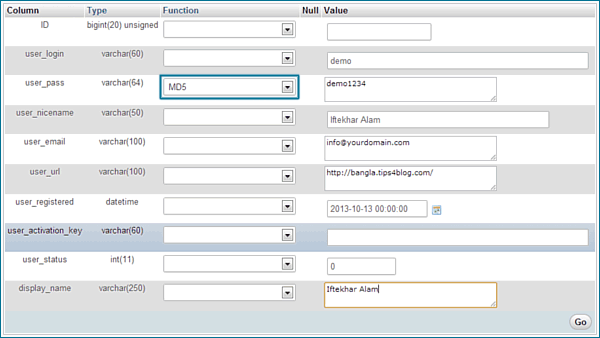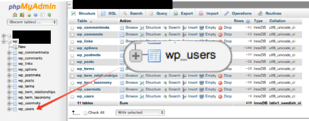 — Browse to your website database wp_users table